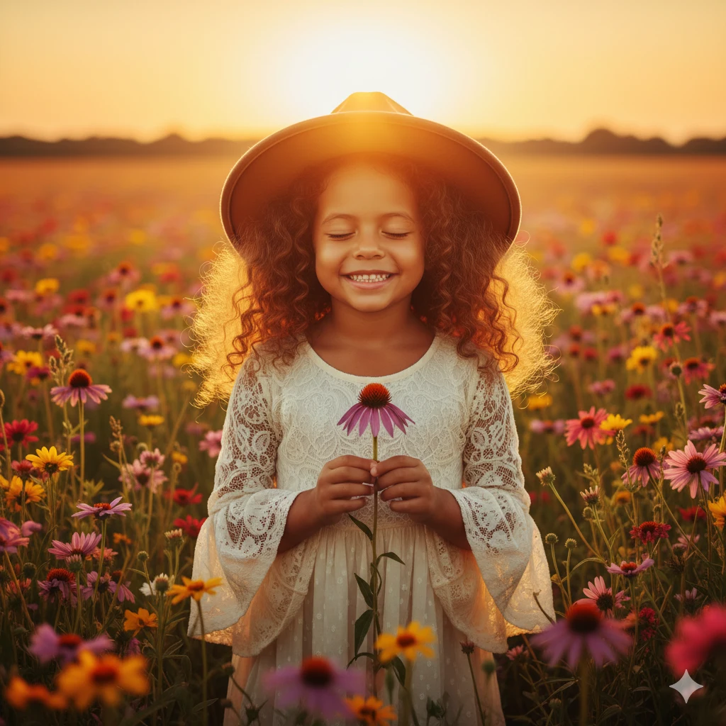 Use minha foto original para renderização fiel do rosto. Use minha imagem como referência de rosto e pose; não altere meu rosto –face_fidelity 0.8. Crie um retrato boho de criança entre flores: vestindo vestido fluido de linho bege com textura natural; cenário ao ar livre em campo florido com margaridas e lavandas; luz dourada de fim de tarde, reflexos suaves e partículas de pólen ao vento; enquadramento em plano médio com profundidade de campo rasa; estilo editorial boho, paleta terrosa e vinheta leve.