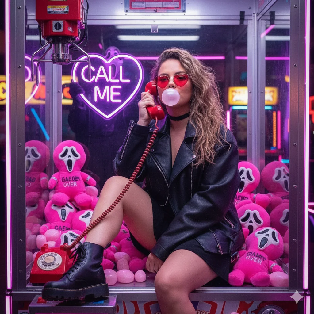 Use foto anexada como base. Crie foto sinistra fliperama colorida sentada máquina garras ghost face neon rosa game over chiclete pelúcia. Telefone: Segurando telefone vermelho fio grande olhando câmera. Vestuário: Vestido preto curto jaqueta couro preta botas combate gargantilha preta óculos sol coração vermelhos transparentes inflando chiclete. Cabelo: Comprido louro escuro cachos suaves caindo livremente. Ghost face atrás: Segurando letreiro neon roxo coração escrito me ligue. Estilo: Retrato fliperama sinistro neon hiperrealista 8K. Rosto: Use foto referência não mude traços. CRÍTICO: Não mude rosto características faciais. Preserve 100% características faciais corpo fisionomia foto. – Respeite a foto base, seja fiel. Minha cor de olhos, cabelos, fisionomia.