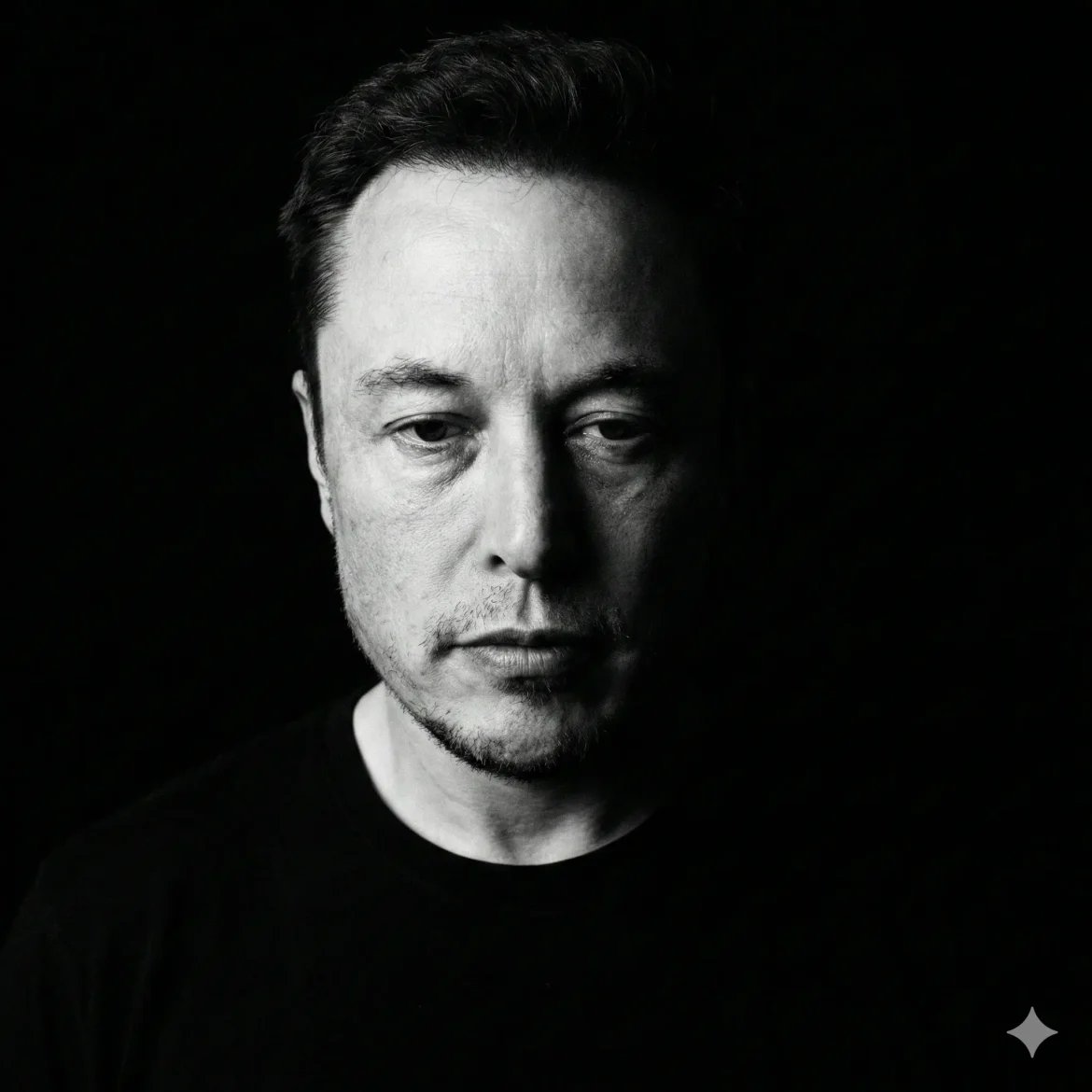 "Close-up intimista e cinematográfico de Elon Musk em um momento raro de contemplação silenciosa. Ele não olha para a câmera, mas para baixo, com uma expressão cansada e intensa. Iluminação dramática de estúdio, estilo 'Chiaroscuro', com apenas metade do rosto iluminada por uma luz lateral dura, o resto em sombras profundas. O fundo é completamente negro e sem textura. Ele veste uma camiseta preta simples. Foco absolutamente nítido nos olhos e nos micro-detalhes da pele: fadiga visível, olheiras, textura realista da barba por fazer. Sensação de ver o homem por trás do mito, em preto e branco de alto contraste."