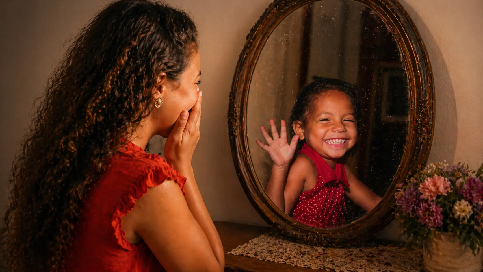 Com as duas fotos anexadas (infância e atual), crie uma imagem onde a versão adulta está diante de um espelho, e o reflexo mostra a versão criança. A criança no espelho está sorrindo e acenando. O adulto está emocionado. Estilo fotográfico realista, iluminação suave.