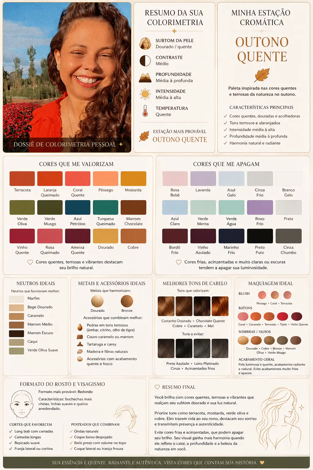 Com base na minha foto, crie um dossiê visual completo de colorimetria pessoal, como uma consultoria profissional. Organize o resultado em blocos bonitos, claros e fáceis de salvar, no estilo dos carrosséis virais de colorimetria do TikTok e Pinterest. Inclua obrigatoriamente: 1. Minha análise geral - subtom - temperatura - contraste - profundidade - intensidade - estação cromática mais provável 2. Minha estação cromática - nome da cartela - descrição curta - características principais 3. Cores que me valorizam - cartela com nomes de cores - roupas - maquiagem - acessórios 4. Cores que me apagam - cartela com nomes de cores - explicação breve do motivo 5. Neutros ideais - branco ou off-white - bege - marrom - cinza - azul-marinho - preto, se funcionar para mim 6. Metais e acessórios ideais - dourado - prata - rosé - bronze - champagne - acabamentos e pedras 7. Melhores tons de cabelo - tons que valorizam - tons que devo evitar - sugestões de mechas ou reflexos 8. Maquiagem ideal - blush - batom - sombra - iluminador - acabamento da pele 9. Visagismo - formato de rosto mais provável - cortes que favorecem - penteados indicados 10. Resumo final - o que mais me valoriza - o que devo evitar - efeito visual que minha cartela transmite Use estética clean, elegante, feminina, moderna e sofisticada. Escreva tudo em português. Use expressões como “mais provável” e “com base na foto” quando não for possível ter certeza. Entregue o resultado em formato visual como um dossiê com a cartela de cores personalizada, semelhante a uma consultoria profissional, mostrando: • cartela provável • cores que me valorizam • cores que me apagam • metais e acessórios ideais • melhores tons de cabelo • corte de cabelo ideal para o formato do meu rosto • penteados que me favorecem • maquiagem ideal • neutros ideais Use a própria foto como referência principal e organize a resposta em layout visual bonito e fácil de salvar.