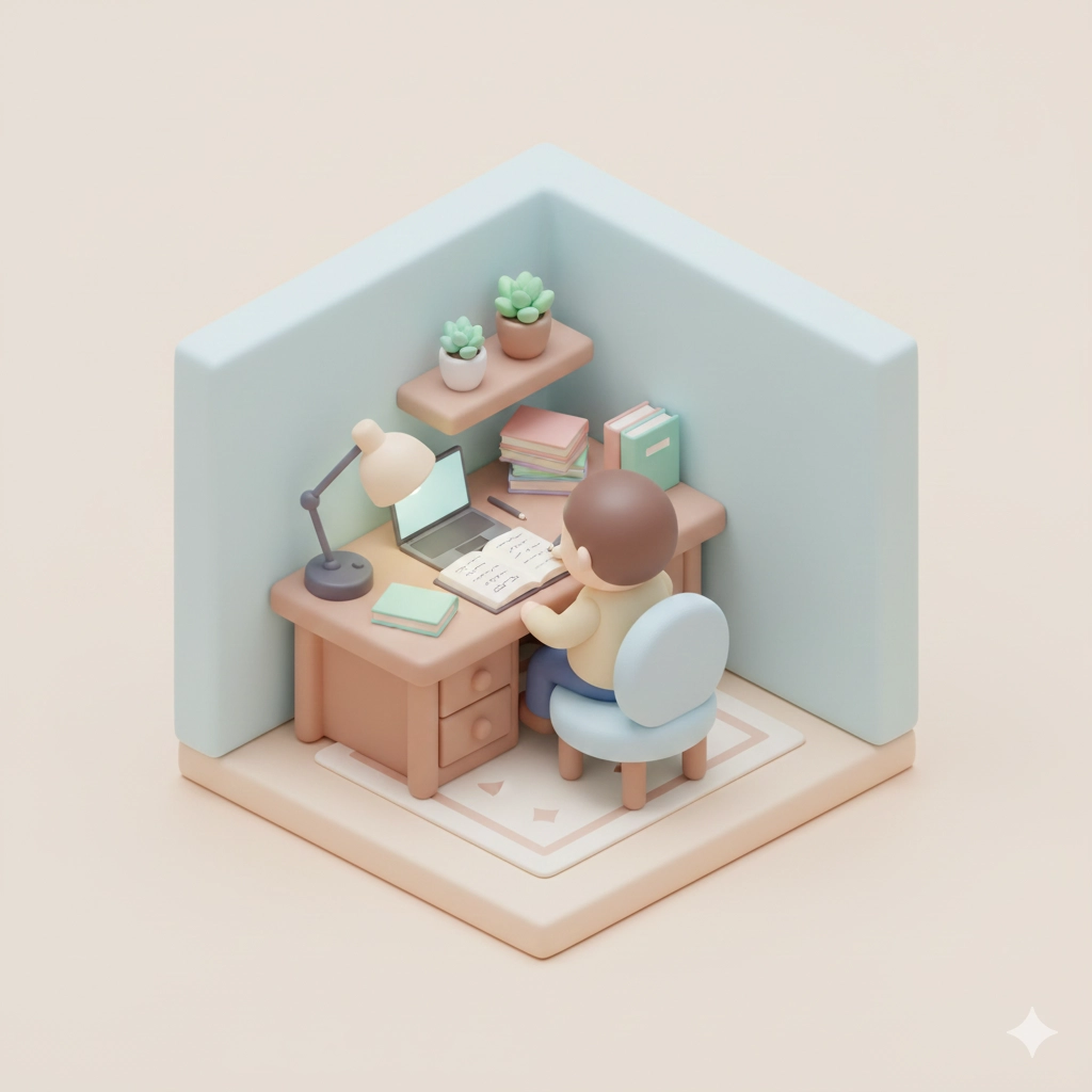 | 1 | Home office (criativo) | “Create a cute 3D isometric illustration of a creative freelancer working at a desk from a classic three-quarter top-down isometric angle, designed in a soft, playful miniature style. The scene uses smooth 3D forms with rounded edges, featuring a clay-like look with pastel colors (mint and coral). Lighting is soft and diffused from above. Include an iMac, a graphics tablet, a cup of coffee with steam, scattered sketches, and a lush monstera plant arranged neatly. Keep the background simple white. The mood is productive and joyful, rendered in high quality, no noise, no realism.” opção 2: “Create a cute 3D isometric illustration of a student studying in a bedroom corner from a classic three-quarter top-down isometric angle, designed in a soft, playful miniature style inspired by trendy social media artwork. The scene uses smooth 3D forms with rounded edges, simplified shapes, and slightly exaggerated proportions, featuring a clay-like or soft plastic look with pastel or gently saturated colors and subtle gradients. Lighting is soft and diffused from above and slightly to one side, producing clean highlights and gentle shadows. Include a desk, open notebook, laptop, stacked textbooks, desk lamp, wall shelf, chair, rug, and small plants arranged neatly with clear spacing and visual balance, using minimal, polished textures for a modern feel. Keep the background simple with a minimal isometric room so the focus stays on the subject. The overall mood should feel cozy, friendly, and joyful, rendered in high quality with smooth edges, no noise, no realism, no complex textures, and no flat illustration style. Use aspect ratio 1:1.” |