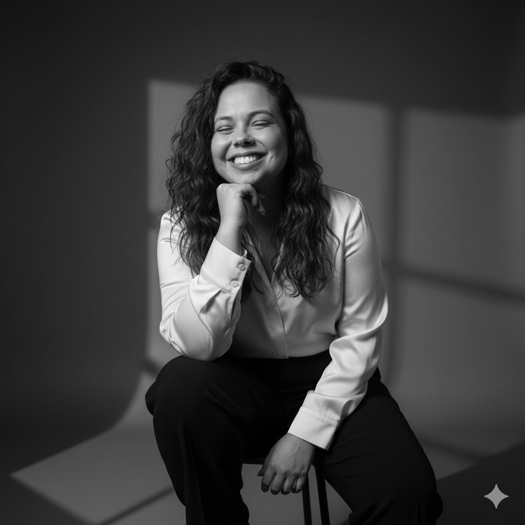 Use [imagem de referência] para rosto, preservando 100% das feições e expressão. Crie retrato em preto e branco em ângulo baixo, sujeito sentado levemente inclinado para frente, vestindo blusa de seda creme e calças pretas. Iluminação: luz principal suave enfatizando planos faciais e textura da blusa; lente 50mm; presença editorial moderna. – Respeite a foto base, seja fiel. Minha cor de olhos, cabelos, fisionomia.