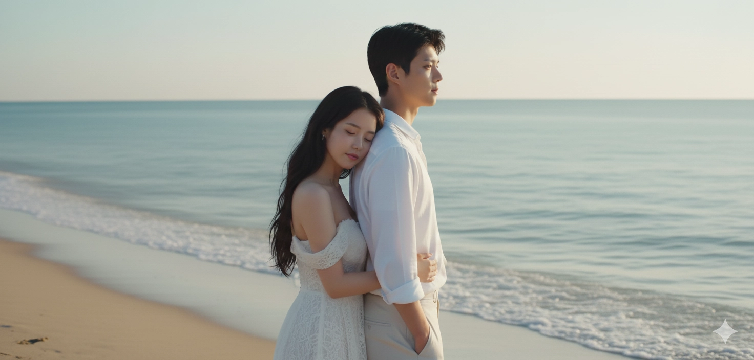 Seja fiel e respeite a foto base. Use minha foto original como referência exata do rosto; não altere minhas feições –face_fidelity 0.8. Crie uma imagem ultra realista com base nessa foto de um casal posando na areia da praia, próximo ao mar. A mulher veste um vestido branco rendado, com ombros de fora e cabelos escuros soltos levemente ondulados, apoiando-se carinhosamente a cabeça nas costas do homem, ela está com os olhos fechados. Ele está de camisa branca e calça clara, de perfil, olhando para frente. A atmosfera é romântica, iluminada pela luz suave do dia, transmitindo cumplicidade e serenidade. Sem mudar as expressões e características. Qualidade HD em 8k.