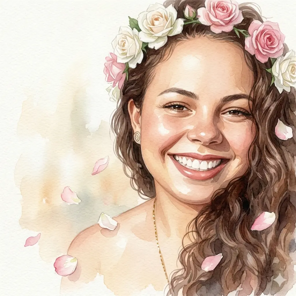 | 01 | Floral suave | Use a foto anexada como base facial. Recrie fielmente rosto e traços, mas com a seguinte estética: retrato feminino delicado com guirlanda de flores brancas e rosas no cabelo, pétalas de rosa ao redor, fundo desfocado em tons de creme e bege, luz natural suave lateral, expressão serena e gentil. Aquarela digital com toque fotorrealista. Keep facial features exactly as original image. | Post Instagram, quadro, cartão digital |