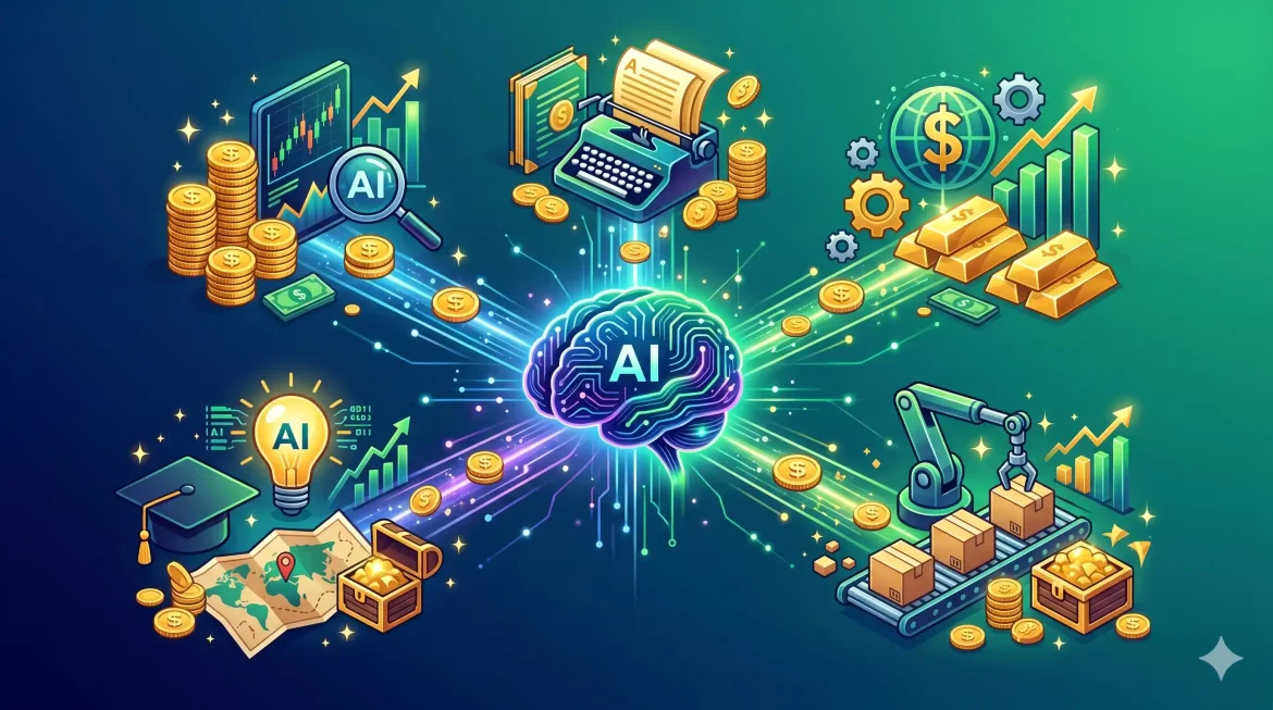 Existe uma diferença enorme entre usar IA para economizar tempo e usar IA para gerar dinheiro. A maioria das pessoas está no primeiro grupo — pergunta ao ChatGPT como reformular um e-mail, gera uma imagem para o Instagram, pede um resumo de texto. Isso é útil. Mas não é rico. As pessoas que estão ficando ricas com IA em 2026 identificaram cinco ferramentas específicas — não para automatizar o que já fazem, mas para criar fontes de receita que antes eram inacessíveis sem equipe, capital ou anos de especialização.