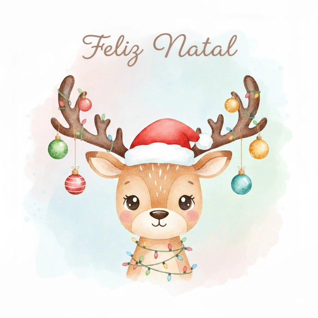 Alce fofo com enfeites de Natal pendurados, texto “Feliz Natal”, desenho simples, fundo branco, aquarela simples, estilo de ilustração de livro infantil.