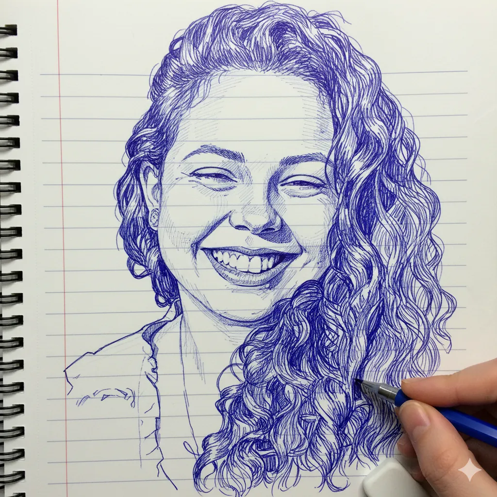 Use minha foto como referência para rosto, preservando 100% das feições, proporções e expressão. Crie desenho estilo esboço a tinta idêntico ao rosto da imagem de referência - mantendo cada traço facial, proporção e expressão exatamente igual. Estilo: uso de tons azuis e brancos com detalhamento intrincado de linhas finas, traçado em fundo estilo página de caderno. Elementos adicionais: mão direita segurando caneta e borracha próximas ao esboço, como se o artista ainda estivesse trabalhando. Técnica: photo-style line drawing ink sketch com acabamento realista e detalhes precisos. – Respeite a foto base, seja fiel. Minha cor de olhos, cabelos, fisionomia.