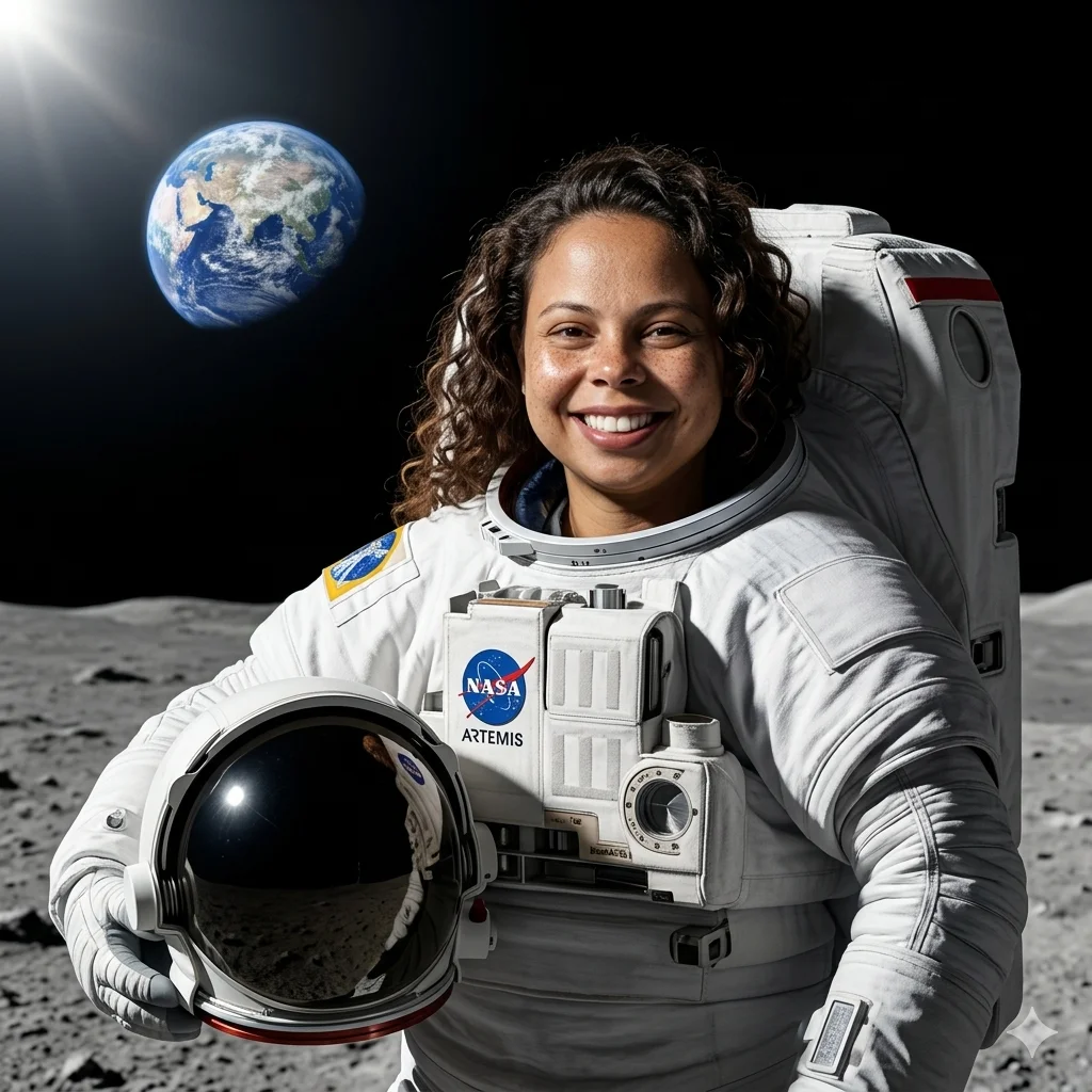 A NASA confirmou: a missão Artemis vai colocar o primeiro ser humano na superfície lunar em décadas — e desta vez com diversidade de gênero e raça que a história nunca viu. Enquanto o mundo aguarda o lançamento real, o Gemini já permite que qualquer pessoa se coloque visualmente dentro dessa história: na superfície da Lua, com a Terra ao fundo, dentro de uma base espacial ou pousando no regolito com o sol rasante iluminando a viseira do capacete. O resultado é tão realista que parece retirado de um documentário da NASA.