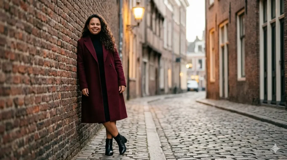 Use the attached photo as facial reference. Recreate my face faithfully (face, features, skin tone) but with the following aesthetic: a professional woman standing in a charming narrow cobblestone alley, leaning lightly against a textured brick wall, one ankle crossed in front of the other, looking at the camera with a relaxed, self-assured expression. She wears a burgundy midi-length coat, black turtleneck and leather ankle boots. The alley has warm ambient light from a nearby street lamp mixed with soft afternoon glow. Background: blurred brick facades and a distant open street. Shot with a 50mm lens, shallow depth of field. Urban lifestyle editorial photography. Aspect ratio 4:5.