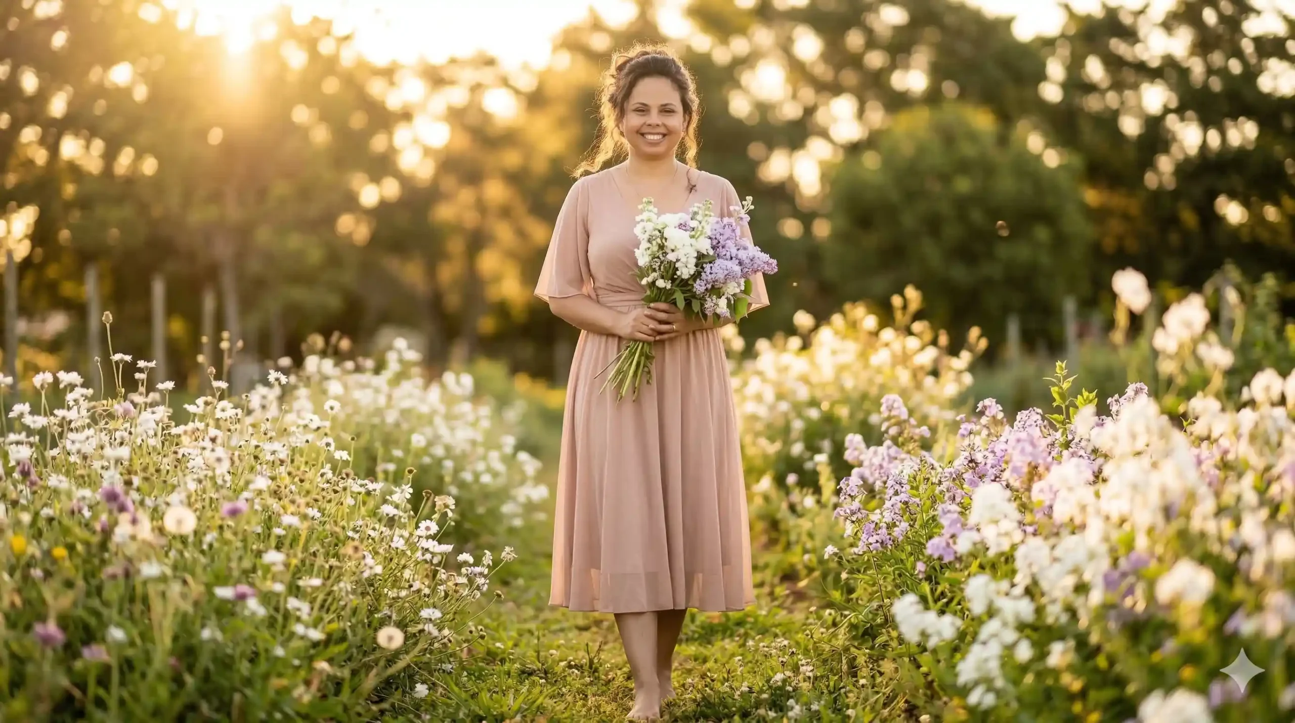 | 03 | Natural — jardim ao amanhecer | Keep facial features exactly as original image. Use a foto anexada como base facial. Recrie-me fielmente (rosto, traços) mas com a seguinte estética: retrato de aniversário de 30 anos em jardim ao amanhecer. Mulher em vestido midi fluido em nude rosado, descalça no jardim com flores silvestres ao redor. Segurando buquê de flores frescas em branco e lilás. Cabelo semi-preso com mechas soltas. Expressão suave e radiante. Luz natural dourada de manhã cedo, bokeh suave ao fundo. Fotografia lifestyle editorial feminina, 3:4. | Retrato delicado e natural — ideal para quem prefere autenticidade ao glamour |