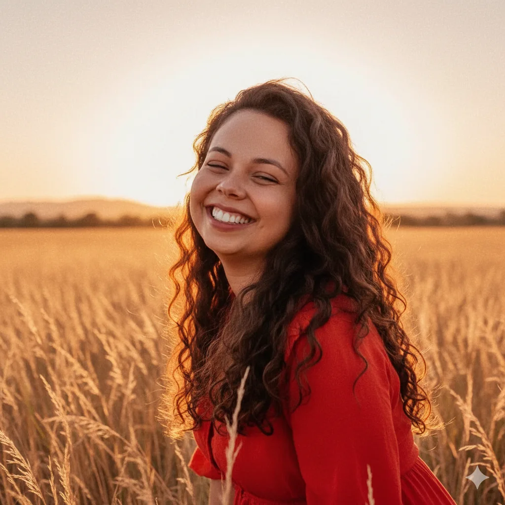 | 29 | Sorriso de verdade | Use a foto anexada como base facial. Recrie-me fielmente (rosto, traços). Fotografia de retrato com sorriso genuíno e luminoso, fundo desfocado de jardim, luz natural suave lateral, enquadramento busto, expressão de alegria real e espontânea, estilo fotografia editorial feminina. Keep facial features exactly as original image. | Presente, WhatsApp, quadro |