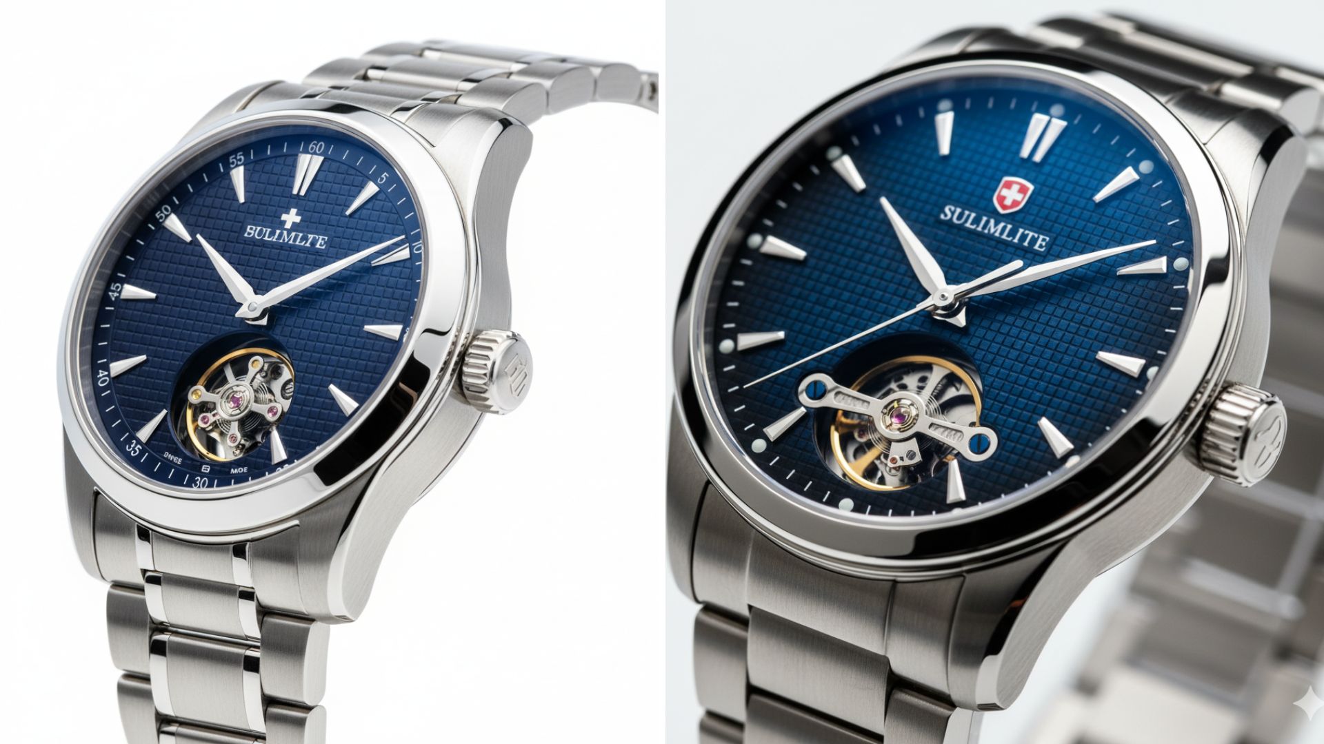 [EN]: “Create professional product photography of luxury watch close detail, macro lighting emphasizing precision engineering, minimalist white background, crystalline glass reflection, premium editorial product photography.”