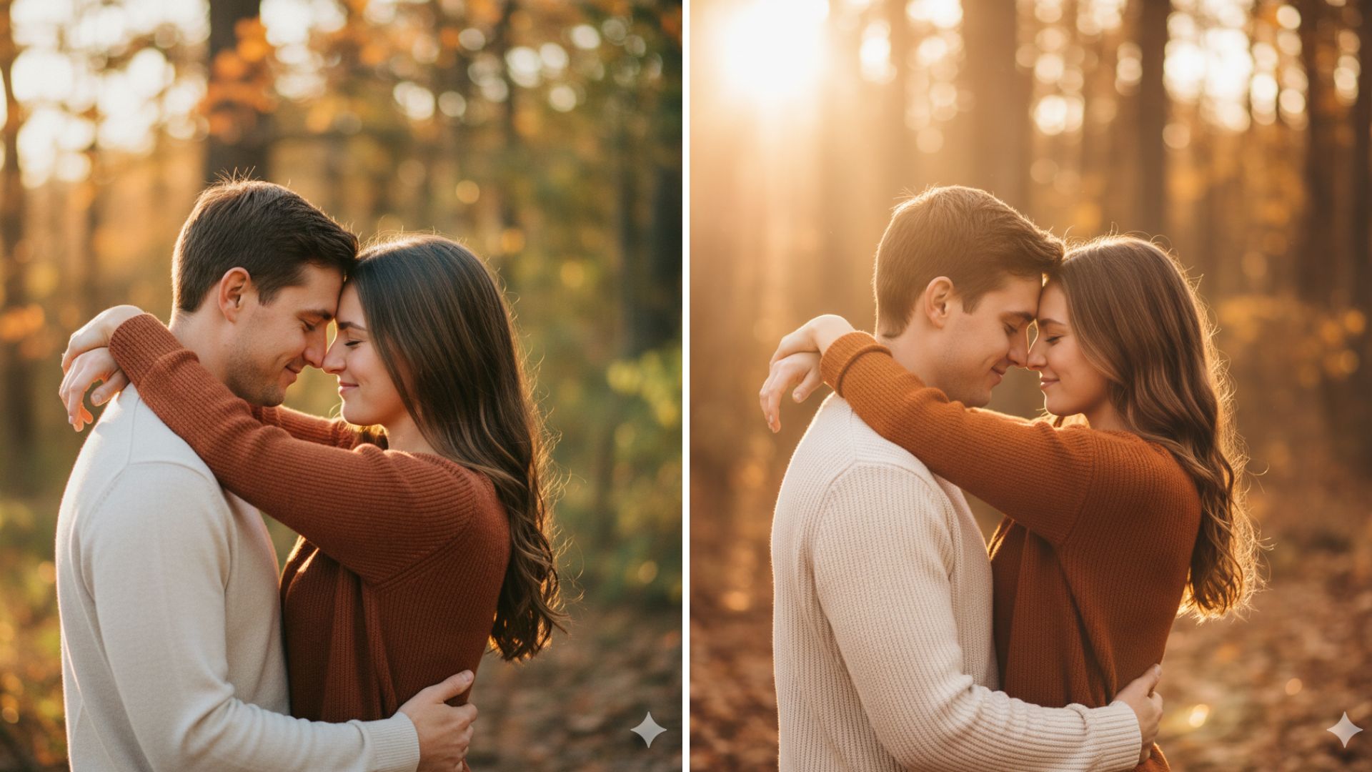 [EN]: “Portrait of couple in soft embrace intimacy, golden hour side lighting, genuine emotionally connected expressions, romantic cozy atmosphere, blurred nature background.”