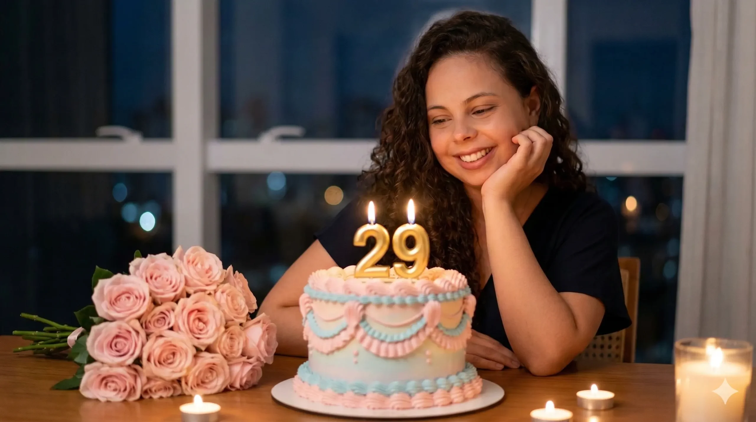 | 06 | Bolo de aniversário — vela acesa, vestido de festa | Recrie-me fielmente com base na foto anexada. Agora gere meu ensaio de aniversário neste estilo: estou na frente de um bolo de aniversário de três andares coberto de rosas em tons de rosa e dourado, com velas acesas. Uso um vestido midi com decote coração em rosa antigo, joias douradas delicadas e salto mule dourado. Estou com as mãos levemente levantadas ao lado do rosto, olhos arregalados de surpresa e sorriso genuíno no momento em que vejo o bolo. A iluminação das velas cria um brilho quente e íntimo no meu rosto. Fundo desfocado de decoração de festa. Fotorrealista, tons de rosa, ouro e creme. Formato 4:5. | Post de aniversário, card de celebração |