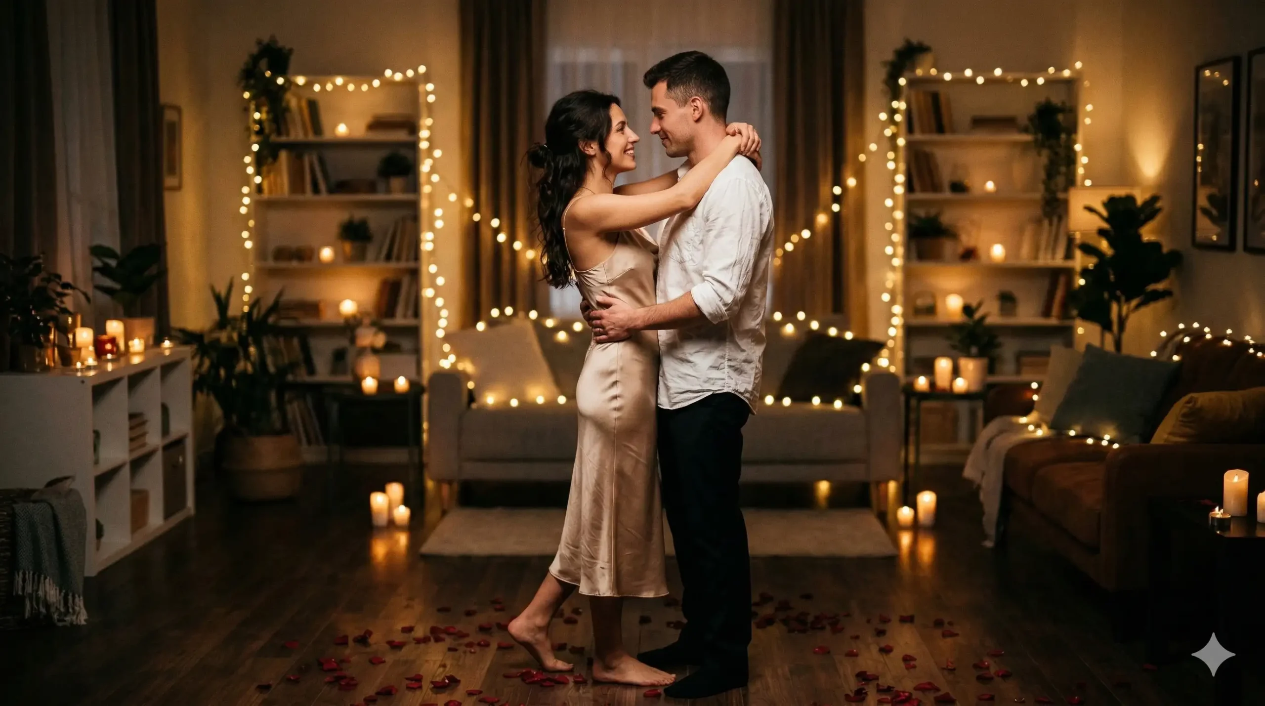 | 06 | Dança na sala | Intimate indoor portrait of a couple slow-dancing in a beautiful living room at night. He leads, one hand on her waist, the other holding her hand extended — she follows with her head tilted slightly against his shoulder, eyes closed, completely at ease. She wears a simple slip dress in champagne silk; he wears dark trousers and a relaxed white dress shirt, first button undone. The room glows with warm candlelight and fairy lights, creating a magical ambient gold around them. No harsh shadows — only the soft, warm, flickering light of the room itself. The background is intentionally blurred and luminous. Deeply romantic. Aspect ratio 4:5. | Aniversário, Dia dos Namorados premium |