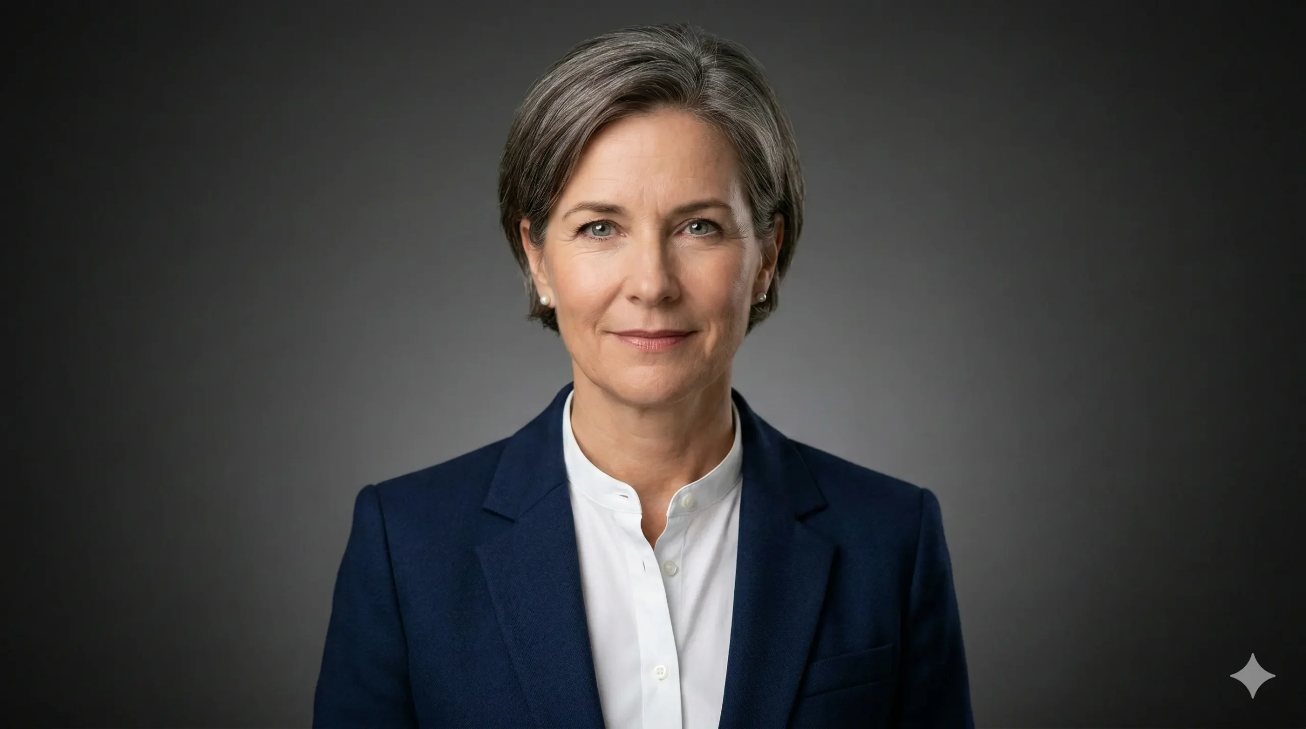 PROMPT 01 — AUTORIDADE MÁXIMA (headshot clássico de liderança) Gere um headshot profissional de alta qualidade. Pessoa: adulto(a) de aparência confiante e experiente. Roupa: terno azul-marinho estruturado com camisa branca impecável, sem gravata. Fundo: estúdio profissional com fundo neutro cinza-escuro gradiente. Iluminação: softbox lateral direito com preenchimento suave no lado esquerdo — sem sombras duras. Expressão: confiante, direta, leve firmeza no olhar. Enquadramento: busto, câmera na altura dos olhos. Estilo: fotografia corporativa de padrão Fortune 500. Qualidade: ultra-realista, alta resolução, sem artefatos.