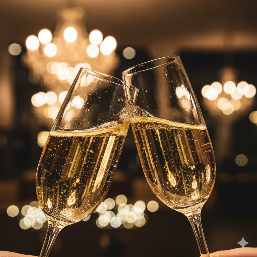 Use a foto anexada como base facial. Recrie-me fielmente (rosto, traços) mas com a seguinte estética: Uma mulher segurando uma taça de champagne brilhante em pose de brinde. Fundo com luzes bokeh douradas e desfocadas. Expressão radiante e feliz. Roupa elegante. Bolhas subindo da taça. Confete colorido flutuando no ar. Momento de celebração e alegria. Cinematografia festiva. Profundidade de campo com foco na taça e rosto. Resultado festivo e inspirador.