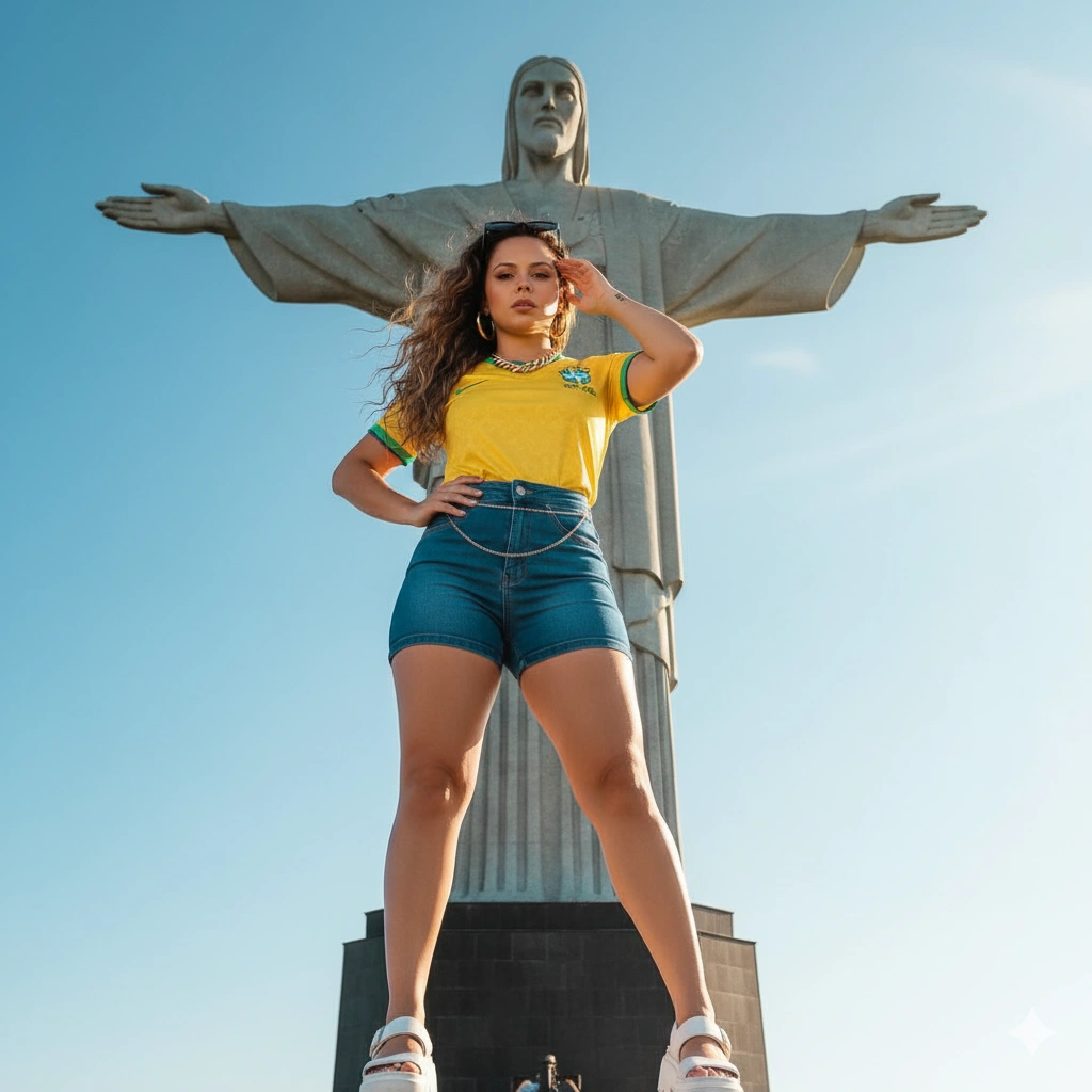 Use a foto anexada como base facial. Recrie-me fielmente (rosto, traços) mas com a seguinte estética: Uma fotografia super realista do sujeito (sem mudar as características faciais da foto de referência) no Rio de Janeiro, especialmente no Cristo Redentor. Ela está vestindo a blusa da seleção Brasileira (amarelo canário e verde-bandeira), um short jeans curto e justo, com uma corrente de ouro na cintura e um cordão de ouro no pescoço, além de brincos de argola. Um óculos escuro preto está acima de sua cabeça, e ela calça uma sandália plataforma branca. A maquiagem é leve, mas bonita, e seus cabelos longos e ondulados, loiros-escuros, esvoaçam levemente ao vento. Ela está em uma pose elegante e confiante, com uma das mãos na cintura e a outra levemente no rosto. A foto é tirada de baixo para cima (low angle), mostrando o Cristo Redentor atrás dela, o céu azul-celeste de início da manhã e leves raios de sol iluminando a cena (soft golden light), criando uma atmosfera elegante e profissional. A cena é capturada com uma lente grande angular 35mm f/2.0. O iso é baixo (iso 100). A profundidade de campo é ampla, capturando tanto o sujeito quanto o monumento em foco nítido. As texturas do tecido, do jeans, do cabelo esvoaçante e da pele são hiper-detalhadas. A composição transmite grandiosidade e orgulho nacional. Finalização com qualidade ultra HD cinematográfica.