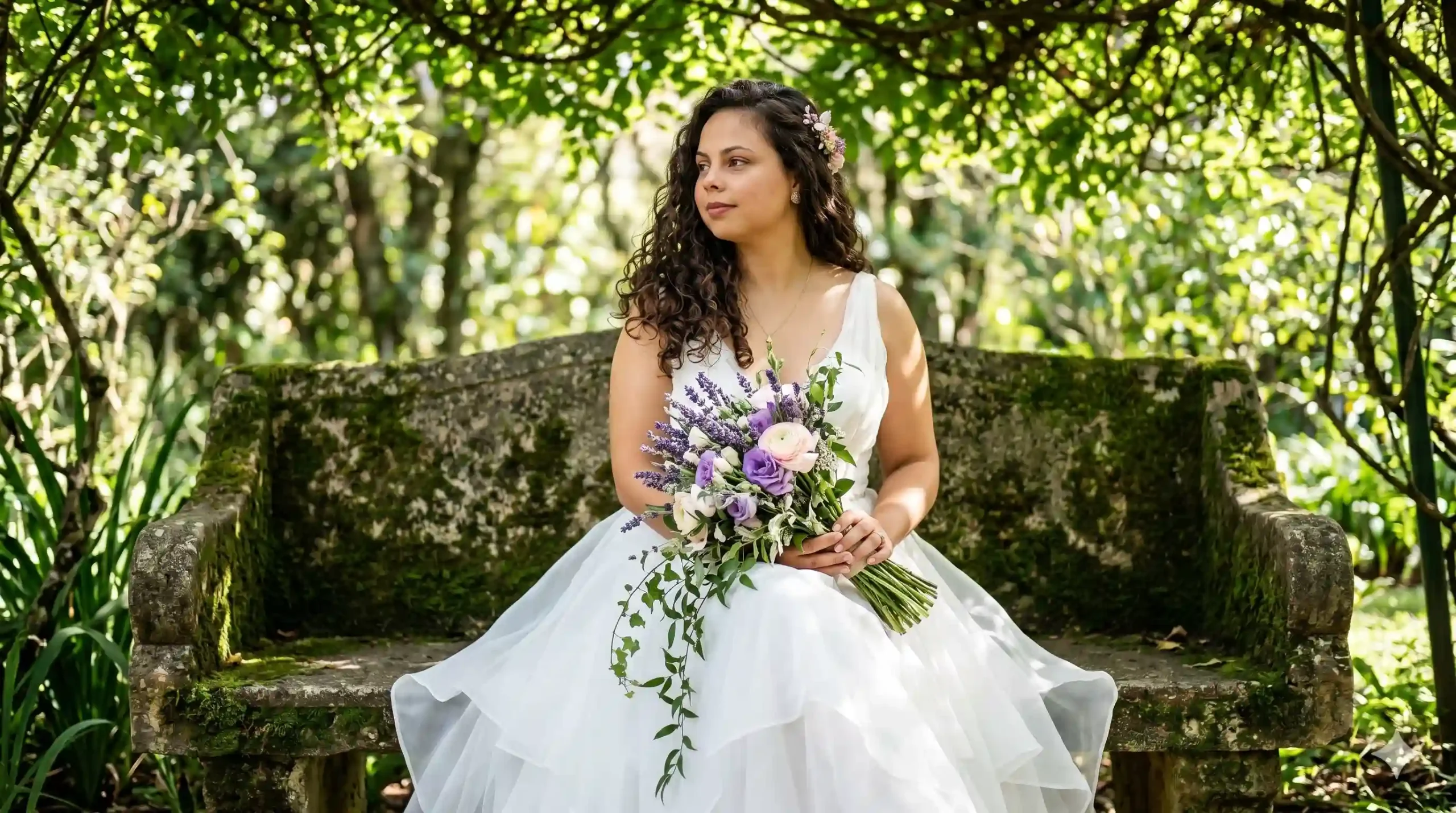 Resultado: Jardim de identidade clara, luz direcional que cria profundidade e ângulo de câmera que posiciona a noiva na cena.